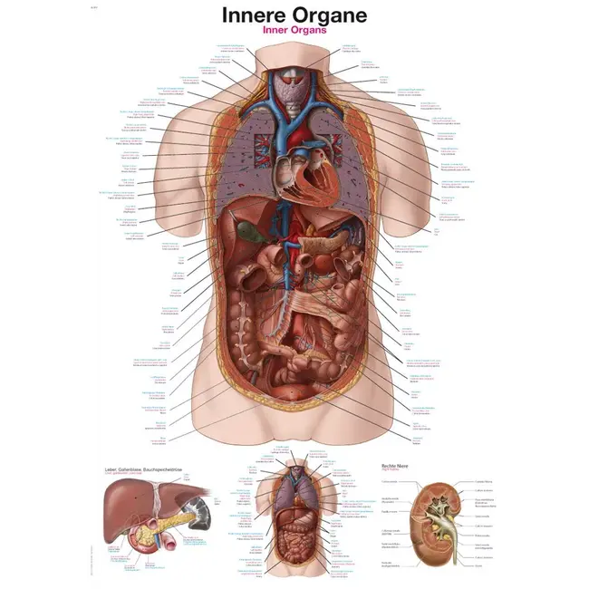 Deze hoogwaardige anatomische poster van de inwendige organen biedt een gedetailleerde en overzichtelijke weergave van het menselijk lichaam. De organen zijn duidelijk gelabeld met nomenclatuur in het Duits, Engels en Latijn. Lees meer.