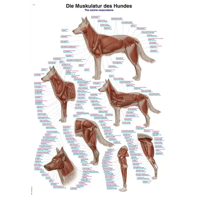 Een professionele en didactisch sterke anatomische wandposter die onmisbaar is voor iedereen die zich bezighoudt met de anatomie en spieropbouw van de hond.