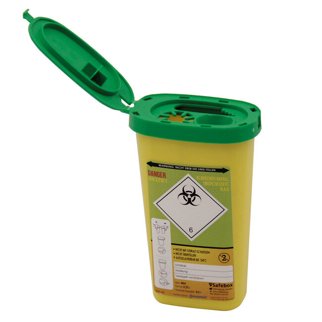 Veilige, infectievrije verwijdering van gebruikte naalden en infuuskatheters. Handig formaat voor in de zak van artsen, verpleegkundigen, ambulancepersoneel en thuiszorgmedewerkers, en ook geschikt voor EHBO-kits, spoedtassen etc.
