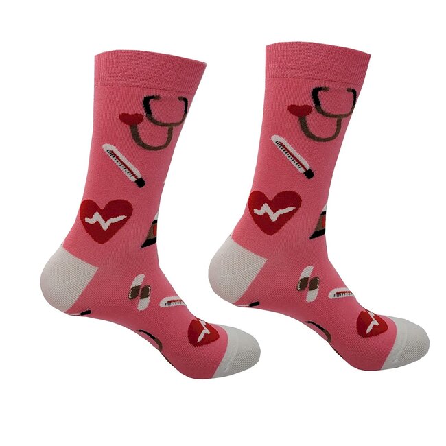 Breng extra vrolijkheid in je werkdag met deze roze medische sokken met icoontjes print. De speelse print met o.a. stethoscopen, hartjes, pillen en thermometers maakt deze sokken perfect voor iedereen die in de zorg werkt — of gewoon fan is van een leuke, opvallende look.