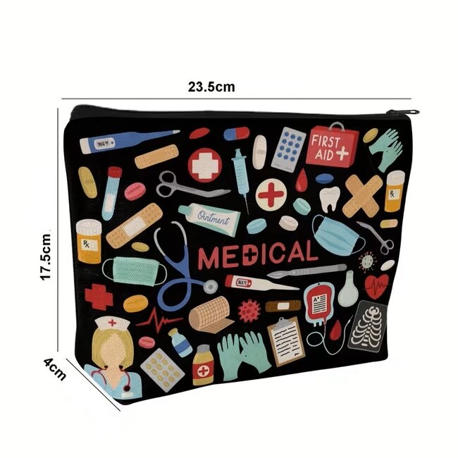 De opvallende print met medische iconen zoals pleisters, medicatie, handschoenen en instrumenten geeft dit etui een unieke en herkenbare uitstraling. Hierdoor is het niet alleen een handig opbergtasje, maar ook een persoonlijk accessoire voor op de werkvloer.