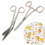 Verpleegkundige scharenset Purrrfect Pets met verbandschaar, chirurgische schaar en kocher. Speelse print met ruimte diertjes. Los of als set te bestellen, optioneel met gravering. Lees meer.